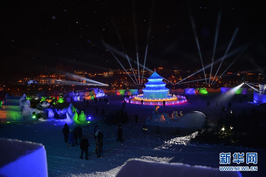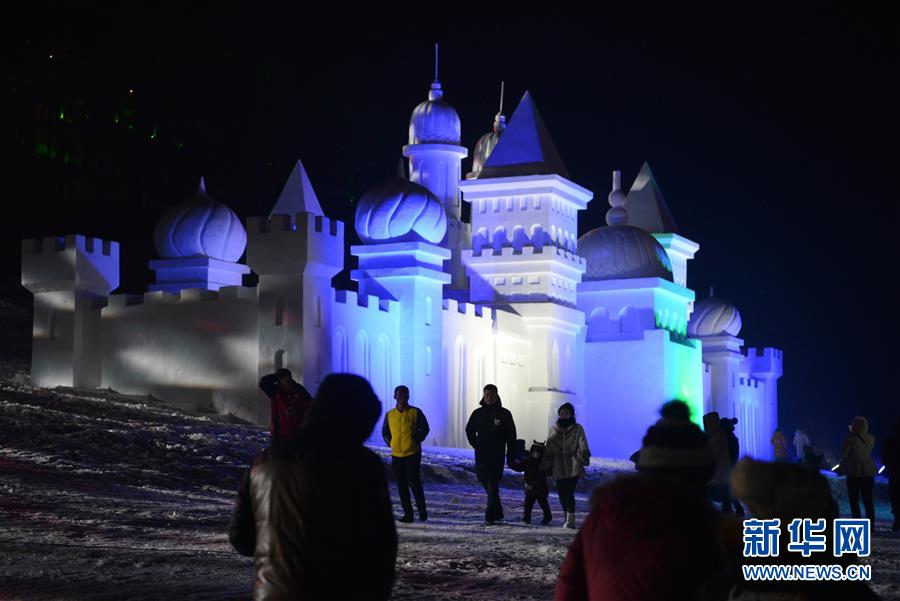 12月21日,游客在冰雪節(jié)開幕式上走過雪雕城堡。新華社記者鄒予攝