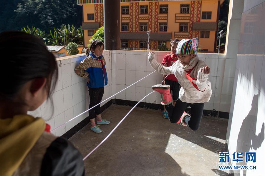 在獨龍江鄉(xiāng)中心小學(xué),孩子們在跳皮筋(2016年11月23日攝)。 新華社記者 胡超 攝