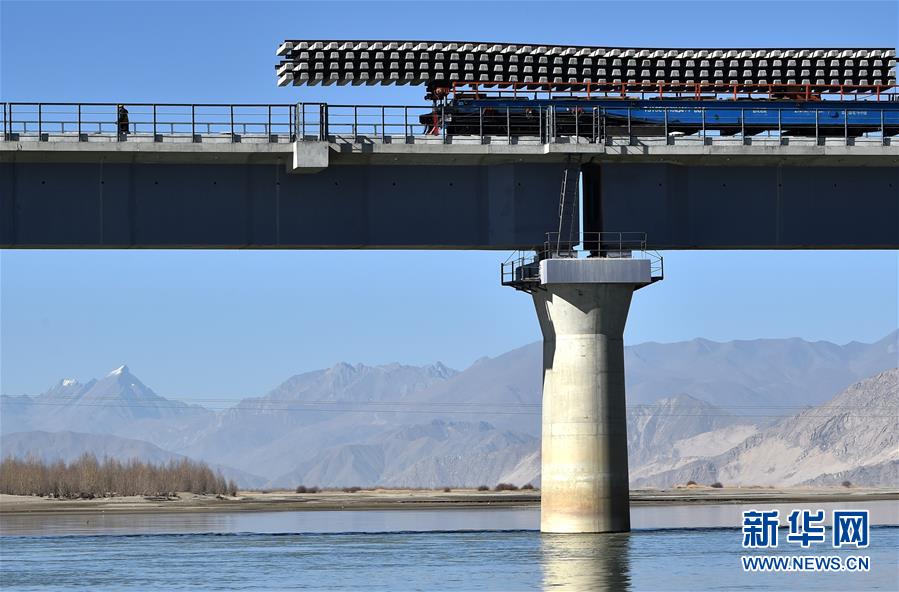 11月26日,施工人員在川藏鐵路拉林段貢嘎雅魯藏布江特大橋上鋪軌。 新華社記者 覺(jué)果 攝