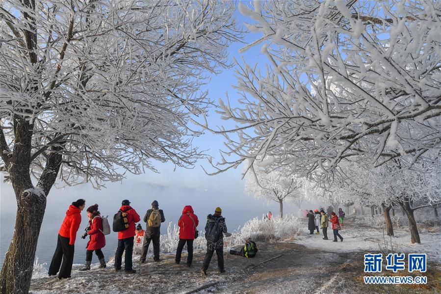 12月12日,游人在吉林省吉林市豐滿區(qū)吉豐東路松花江畔觀賞霧凇美景。