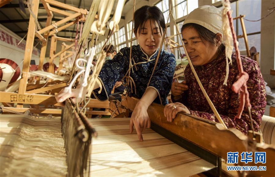 12月25日,在衡水市冀州區(qū)一家老粗布生產(chǎn)企業(yè),田園棉手織粗布傳承人(左)在指導(dǎo)村民織布。 2018年以來(lái),河北省衡水市冀州區(qū)依托當(dāng)?shù)氐氖〖?jí)非遺田園棉手織粗布技藝資源,采取“非遺+扶貧”的模式,通過(guò)非遺傳承人開(kāi)展技能培訓(xùn)、老師傅傳幫帶等,讓貧困村民在傳承非遺文化的同時(shí)學(xué)習(xí)傳統(tǒng)技藝,助力脫貧致富。 新華社記者 李曉果 攝