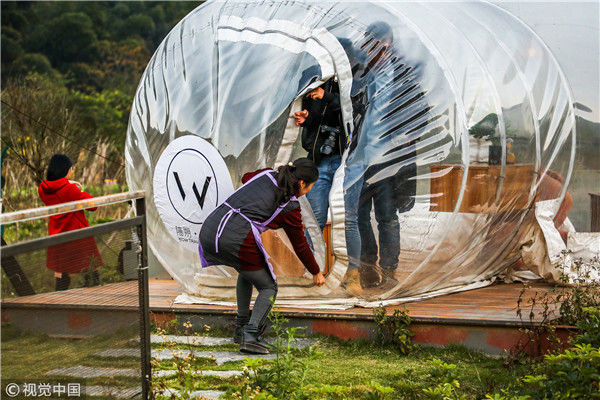 2018年12月17日,廣西桂林,陽(yáng)朔縣遇龍河畔。主人引領(lǐng)游客走進(jìn)泡泡屋。