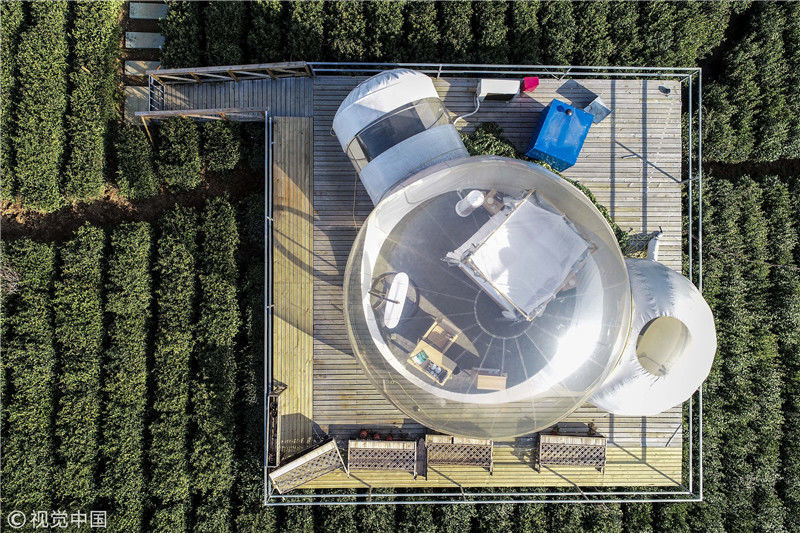 2018年12月18日,江蘇常州金壇茅山百畝茶田中的帳篷酒店和泡泡屋美不勝收。這里打造的帳篷,泡泡屋極具特色,可以讓游客與大自然零距離接觸,這種形式的“酒店”十分撩人,深受歡迎。韓加君/視覺(jué)中國(guó)
