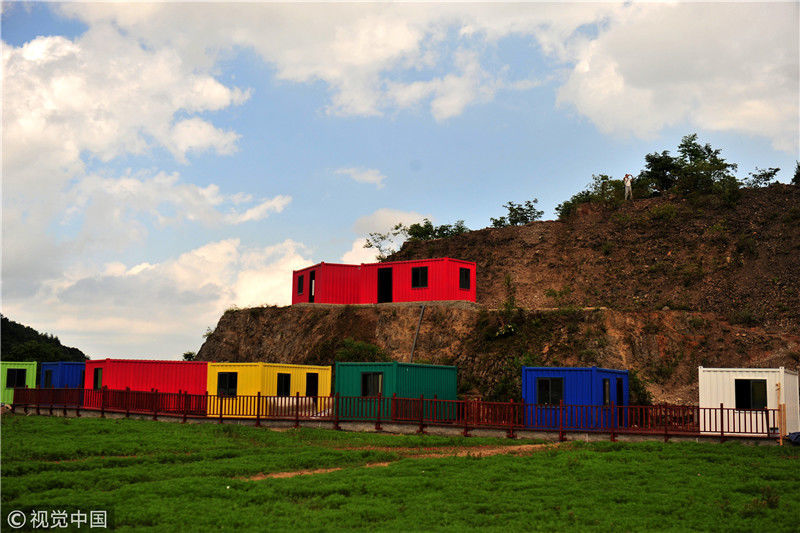 2018年6月9日,湖北省宜昌市夷陵區(qū)樟村坪鎮(zhèn)羊角山村“云上西寨”康養(yǎng)綠地正在建設(shè)的“集裝箱”民俗項(xiàng)目區(qū)風(fēng)景。張國(guó)榮/視覺(jué)中國(guó)