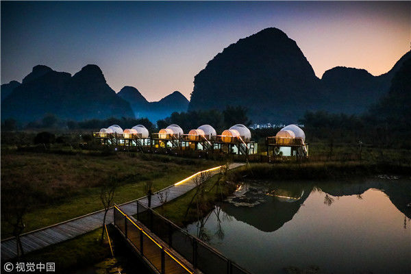 2018年12月17日,廣西桂林,陽(yáng)朔縣遇龍河畔。黃昏時(shí)分,游客站在觀景臺(tái)觀賞泡泡屋及周邊景觀。