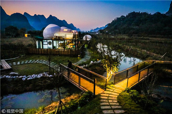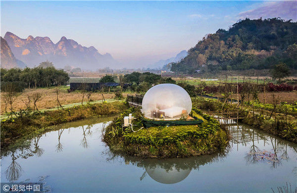 最近這幾年,中國(guó)的民宿風(fēng)越刮越猛,各地精品民宿紛紛如雨后春筍一樣冒出了,而且他們用其更獨(dú)特的設(shè)計(jì)感吸引著人們的目光。其實(shí)對(duì)比星級(jí)酒店,民宿最大的優(yōu)勢(shì),就是設(shè)計(jì)風(fēng)格更獨(dú)特,更具藝術(shù)感,也更符合人們的審美要求,同時(shí)又能做到比星級(jí)酒店更舒適,更適合度假,所以大家現(xiàn)在出行都更熱衷于選擇民宿。圖為2018年12月18日,廣西桂林,陽(yáng)朔縣遇龍河畔。晨光中的泡泡屋。棋簿紫/視覺(jué)中國(guó)