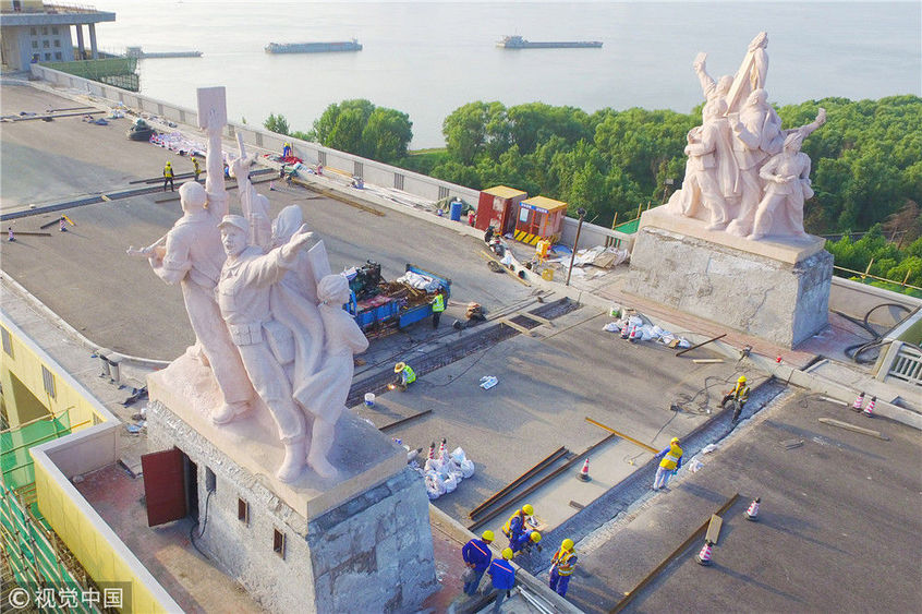2018年6月24日,南京長江大橋修葺一新的淡粉色的工農(nóng)兵雕像。