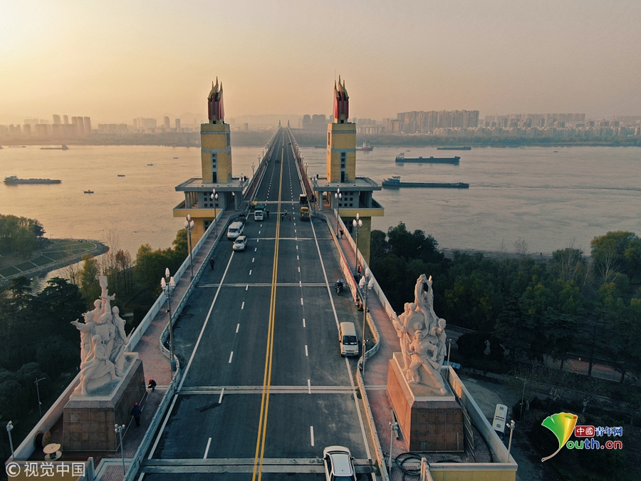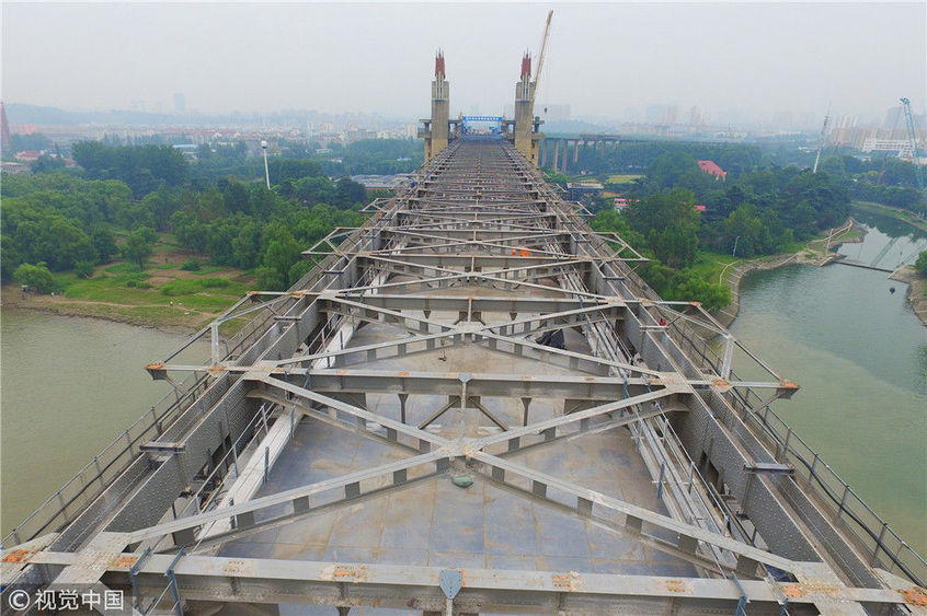 2017年9月19日,南京長江大橋正橋的混凝土面板已經(jīng)全部拆除,僅剩交錯縱橫的鋼桁架橫跨在長江之上,從高空俯瞰猶如一條“鋼鐵巨龍”。