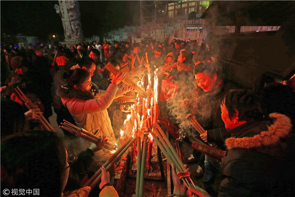 2018年12月31日晚,市民在江蘇常州天寧寶塔廣場燒香祈福。