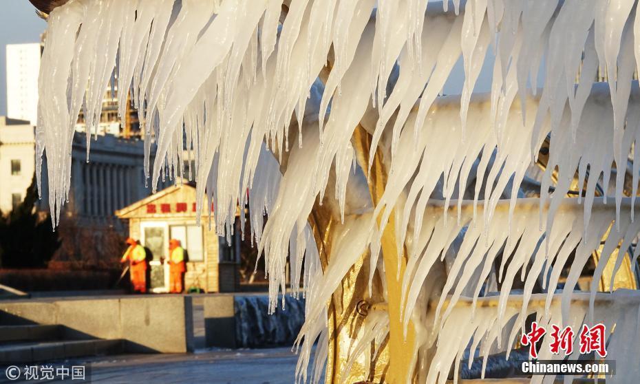 渤海海水在北風(fēng)的作用下涌向岸邊,在大連東港海岸護欄上凝結(jié)成冰凌,形成約有兩公里的冰凌奇觀。圖為大連市東港海岸護欄結(jié)滿晶瑩剔透的冰棱。圖片來源:視覺中國