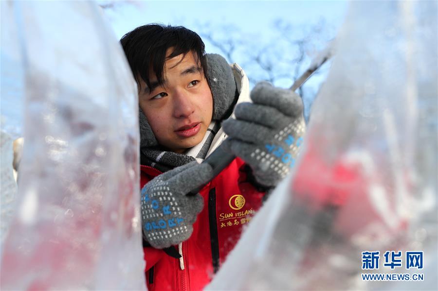 12月27日,選手在比賽中完善冰雕作品。 當(dāng)日,第十六屆黑龍江省大學(xué)生冰雕藝術(shù)設(shè)計創(chuàng)作大賽在哈爾濱兆麟公園落下帷幕,全省高校共有99支隊伍參賽。 新華社記者曹霽陽攝