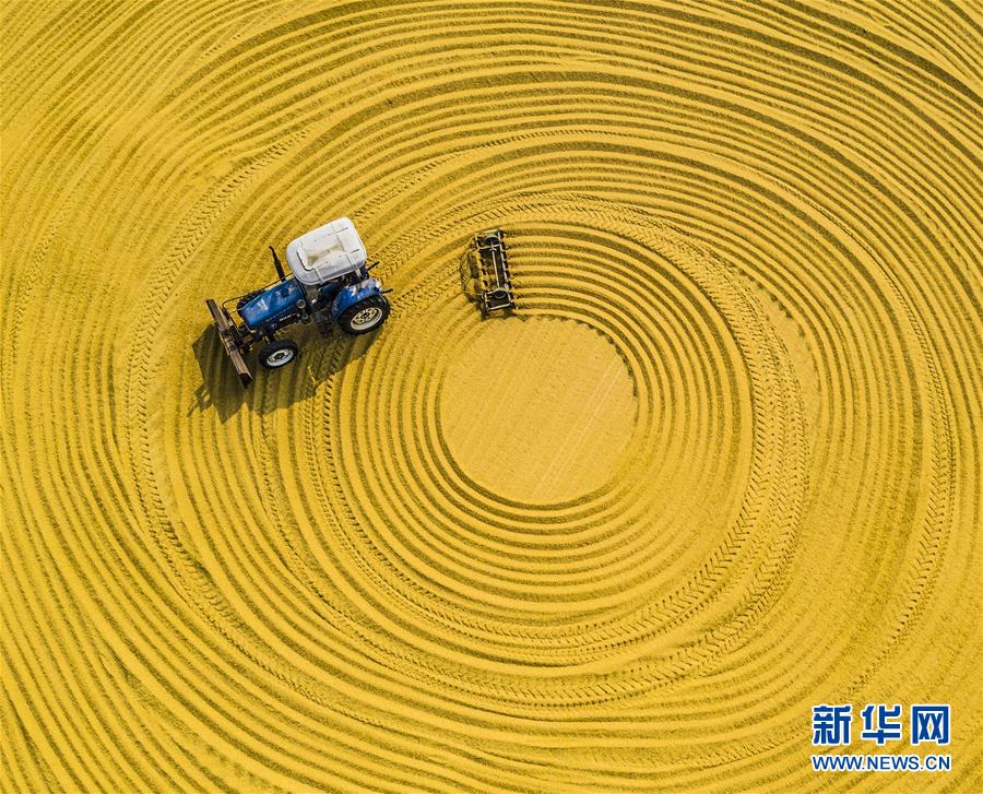 10月23日,在位于江蘇泗洪的洪澤湖農(nóng)場(chǎng),一臺(tái)農(nóng)機(jī)在翻曬稻谷。