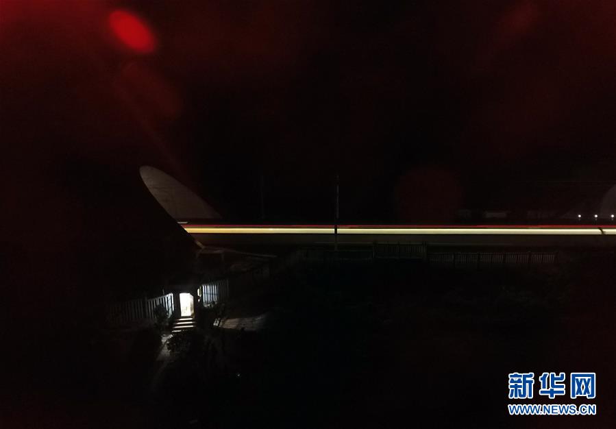 一列動車夜間穿越花甲山隧道進入壇柱隧道(左)(2月11日無人機航拍)。廣西南寧市前往北部灣沿海城市的鐵路,穿越巍巍群山,列車飛馳其間需要穿過大批隧道,僅南寧市到北海市的鐵路隧道就有18個。