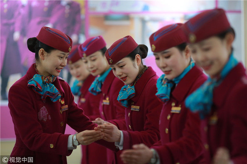 2018年12月27日,四川成都,為備戰(zhàn)即將開(kāi)通的成雅鐵路,中國(guó)鐵路成都局集團(tuán)有限公司成都客運(yùn)段動(dòng)車二隊(duì)對(duì)成雅動(dòng)車的乘務(wù)人員進(jìn)行理論、形體、服務(wù)禮儀等內(nèi)容的培訓(xùn)。