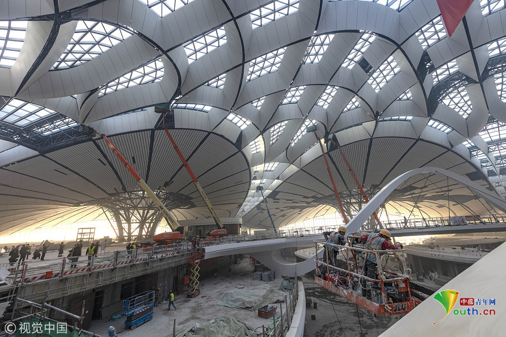 中國青年網(wǎng)北京12月20日電 2018年12月19日,北京大興國際機場航站樓的屋面已基本完工,一只金色“鳳凰”完整地出現(xiàn)在北京城南。航站樓的室內(nèi)裝修在有條不紊的推進中。