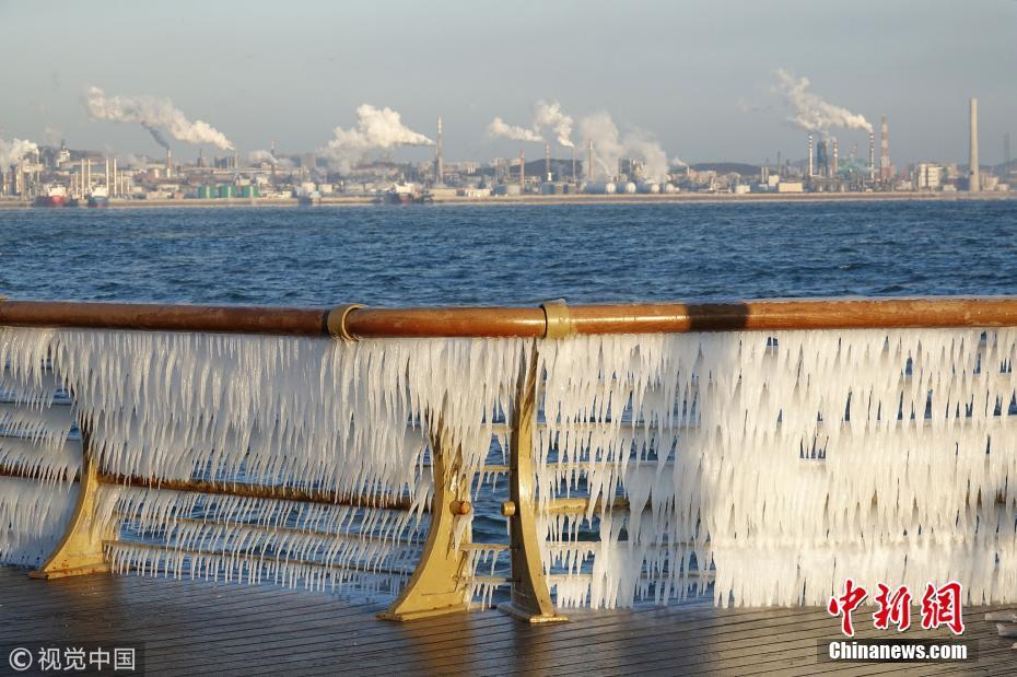 渤海海水在北風的作用下涌向岸邊,在大連東港海岸護欄上凝結(jié)成冰凌,形成約有兩公里的冰凌奇觀。圖為大連市東港海岸護欄結(jié)滿晶瑩剔透的冰棱。圖片來源:視覺中國