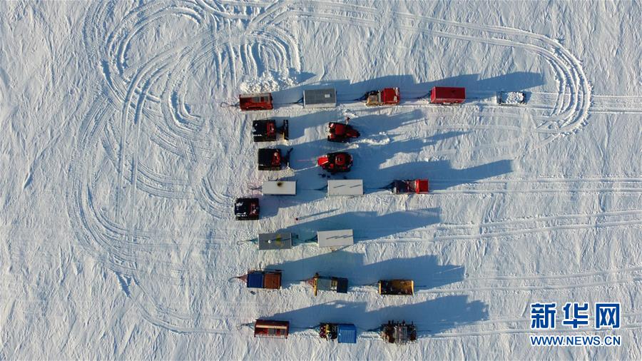 昆侖隊距離南極中山站990公里處的營地(2019年1月1日無人機拍攝)。