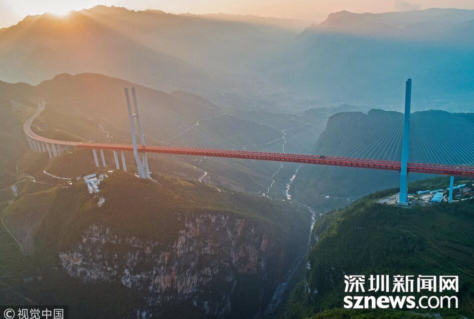 當(dāng)日,杭瑞高速貴州省畢節(jié)至都格(黔滇界)公路北盤江大橋上云霧繚繞,美景如畫(huà)。北盤江大橋主橋跨徑720米,橋面到谷底垂直高度565米。