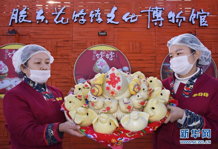 1月8日,工作人員展示一款賀壽團(tuán)圓的花餑餑。