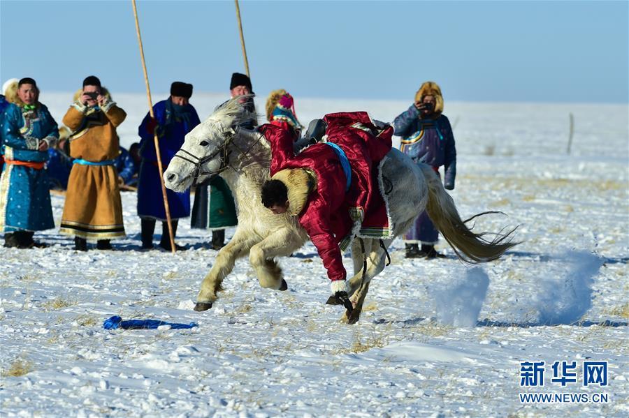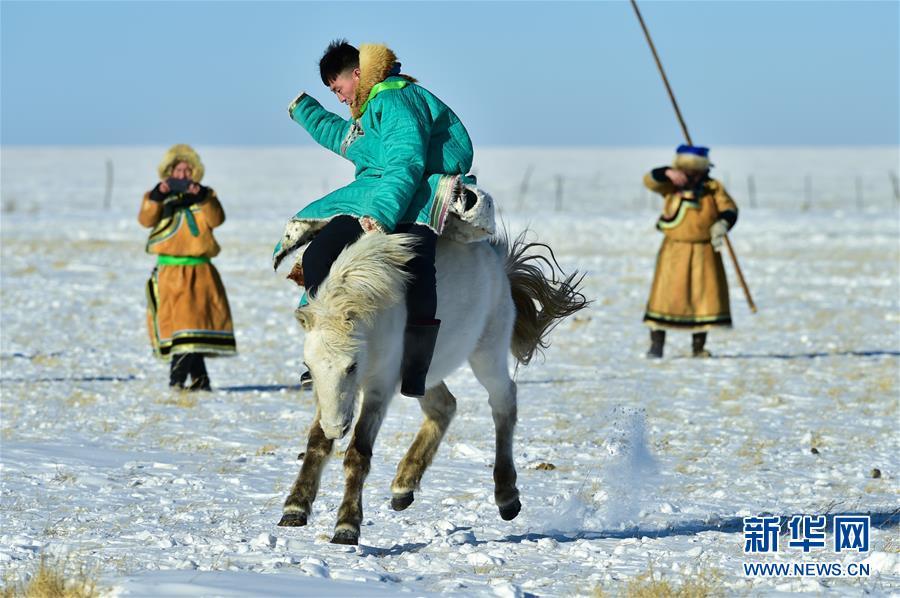 1月8日,牧民表演馬背拾哈達(dá)。 時(shí)下正值草原冬季旅游旺季,內(nèi)蒙古自治區(qū)西烏珠穆沁旗的牧民們?cè)谘┰弦徽股硎?,為游客展現(xiàn)獨(dú)特的民族風(fēng)情。 新華社記者 鄒予 攝