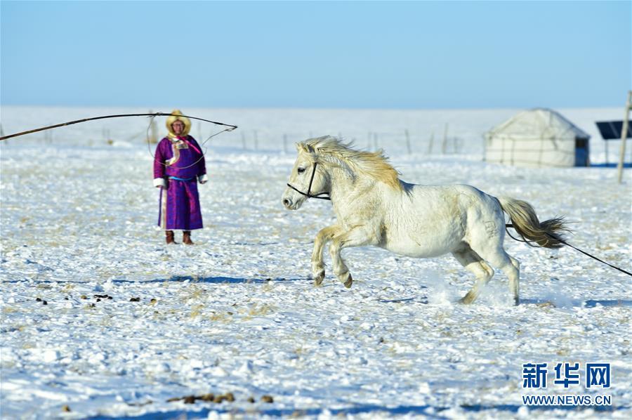 1月8日,牧民在馴服一匹烈馬。 時(shí)下正值草原冬季旅游旺季,內(nèi)蒙古自治區(qū)西烏珠穆沁旗的牧民們?cè)谘┰弦徽股硎?,為游客展現(xiàn)獨(dú)特的民族風(fēng)情。 新華社記者 鄒予 攝