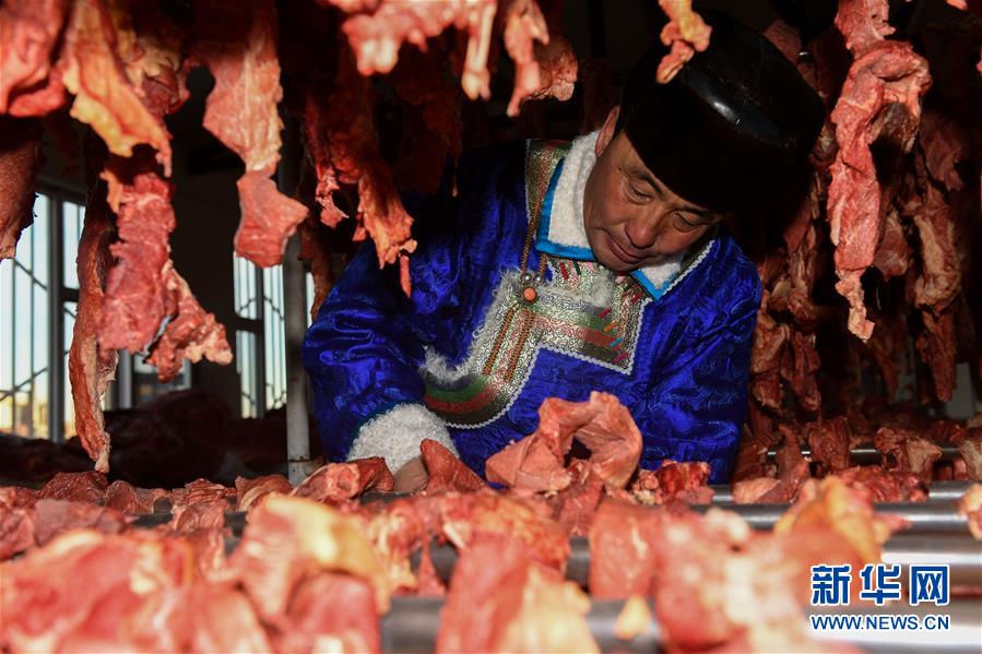 1月9日,牧民伊拉代在查看風(fēng)干牛肉。 新華社記者 劉磊 攝