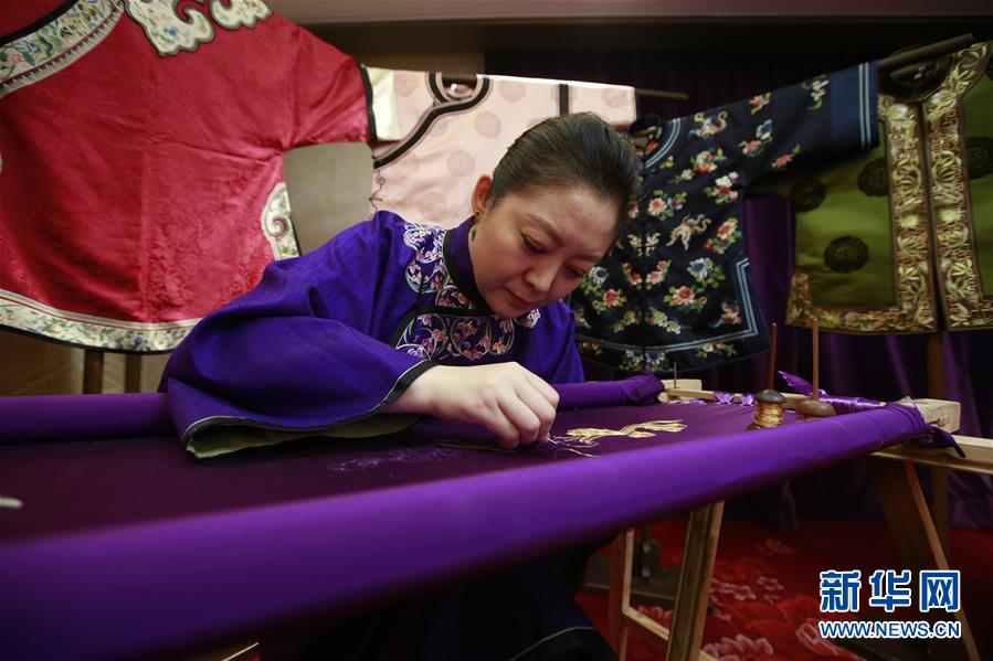 1月12日,在北京“碧泓云想”服裝設計工作室,高定服裝設計師畢紅在為中式服裝制作刺繡紋樣。畢紅設計的中式服裝以棉、麻、真絲等面料為主。春節(jié)來臨,其團隊加班加點為顧客趕制中式服裝。