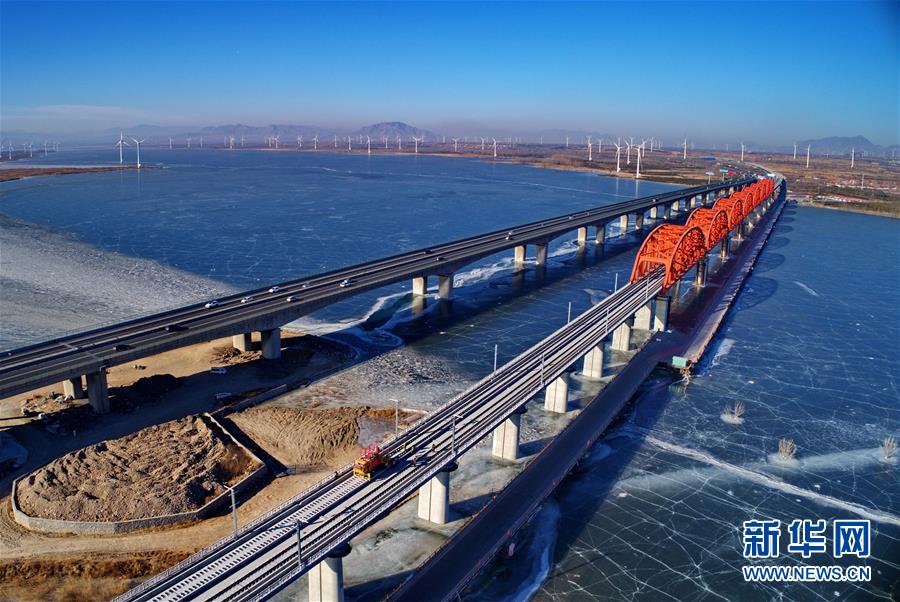 1月13日,中鐵三局的工人在京張高鐵官?gòu)d水庫(kù)特大橋進(jìn)行鋪軌作業(yè)(無(wú)人機(jī)拍攝)。 新華社記者 楊世堯 攝