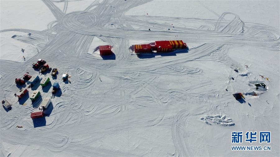 1月13日無(wú)人機(jī)拍攝的中國(guó)第35次南極科考隊(duì)昆侖隊(duì)營(yíng)地(左)、昆侖站(中)與深冰芯房。  新華社記者 劉詩(shī)平 攝