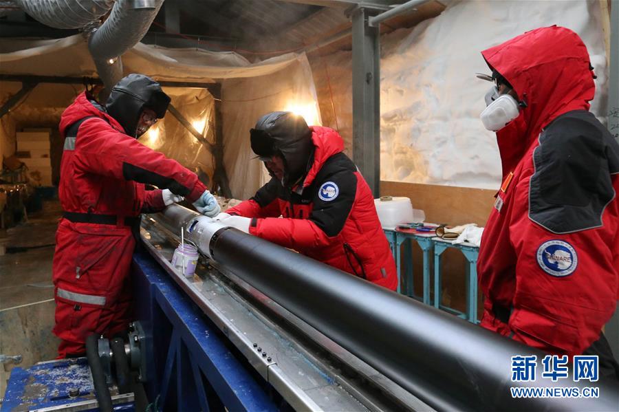 科考隊(duì)員處理鉆取的2.8米長(zhǎng)冰芯(1月12日攝)。  新華社記者 劉詩(shī)平 攝