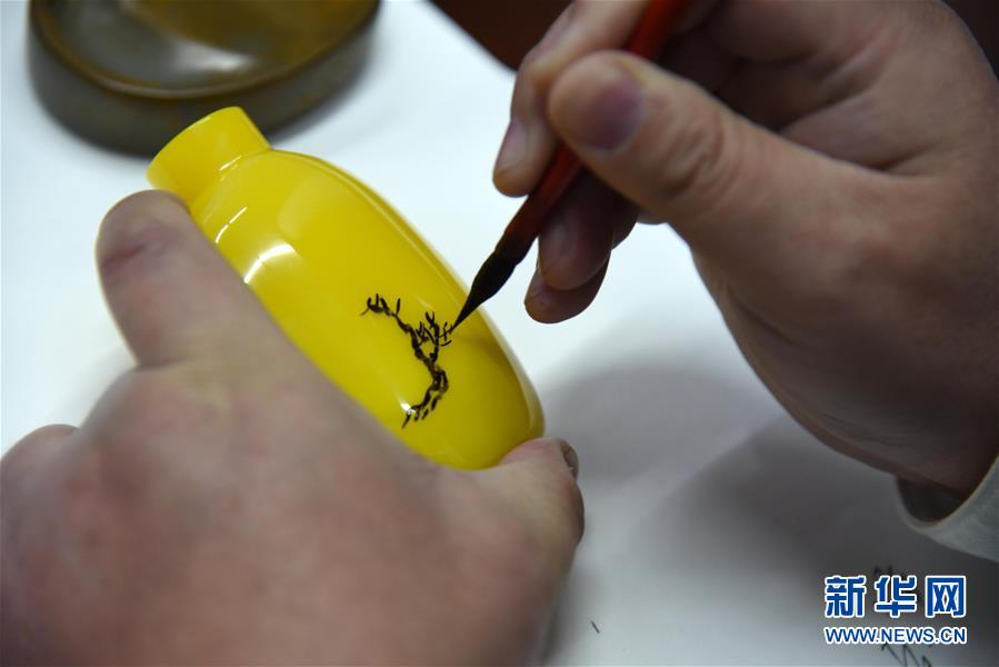 1月11日,孫云毅在為一只雞油黃鼻煙壺作畫。 新華社記者王凱攝