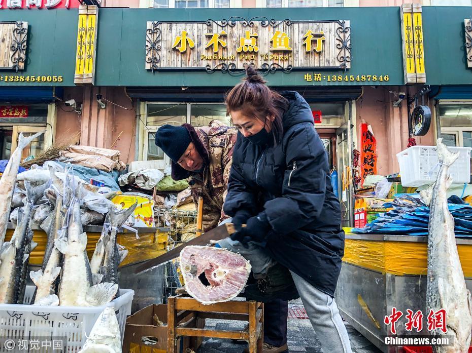 寒冬臘月是黑龍江撫遠(yuǎn)的凍魚(yú)銷售旺季。讓人大開(kāi)眼界的是,一二百斤大魚(yú)得鋸開(kāi)了賣;最讓魚(yú)販子開(kāi)心的是,最多一天進(jìn)賬5萬(wàn)元。魚(yú)販子半開(kāi)玩笑地說(shuō):不是說(shuō)數(shù)錢數(shù)到手抽筋嗎?進(jìn)錢最多的一天,還真差不多。圖為1月12日,黑龍江省佳木斯市撫遠(yuǎn)東極魚(yú)市,商戶在用鋸截?cái)鄡鲷~(yú)。棋簿紫 攝 圖片來(lái)源:視覺(jué)中國(guó)