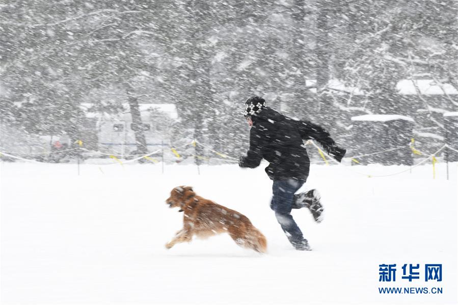 1月13日,在美國首都華盛頓,一名男子與寵物狗在林肯紀念堂旁玩耍。 近日,美國首都華盛頓及其周邊地區(qū)普降暴雪。降雪導致部分航班晚點或取消,道路交通事故增多。 新華社記者 劉杰 攝