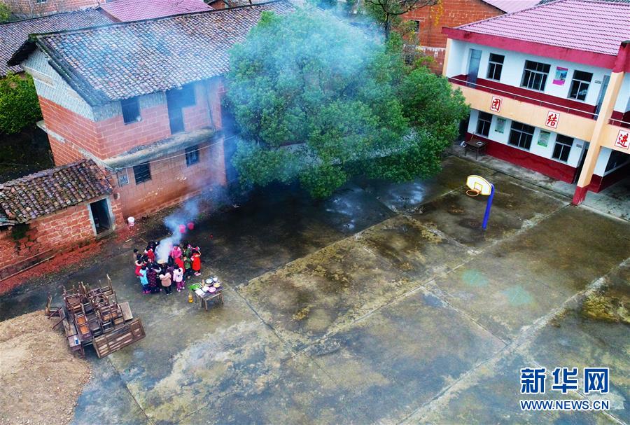 1月3日,章站亮和學(xué)生們一起在學(xué)校內(nèi)燒飯(無人機(jī)拍攝)。 新華社記者 胡晨歡 攝