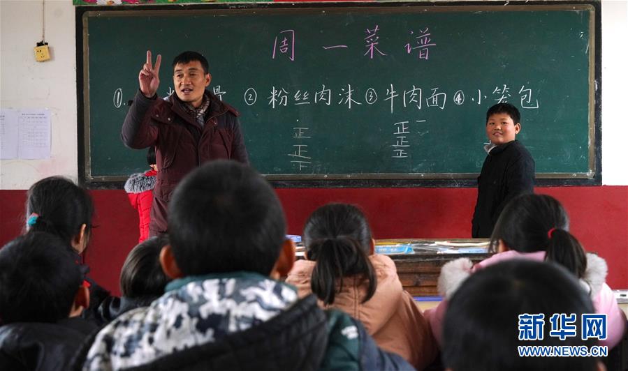1月4日,章站亮(左)和學(xué)生們召開(kāi)“每日食譜選舉會(huì)”,共同選出下次學(xué)生們想吃的餐點(diǎn)。 新華社記者 胡晨歡 攝