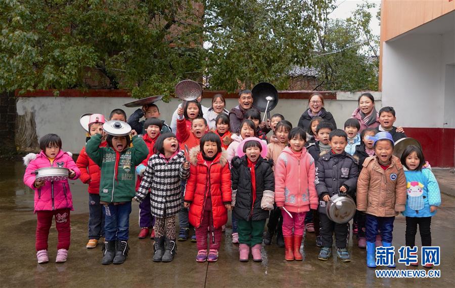 1月4日,章站亮(后右三)和全校的學(xué)生以及老師合影。 新華社記者 胡晨歡 攝
