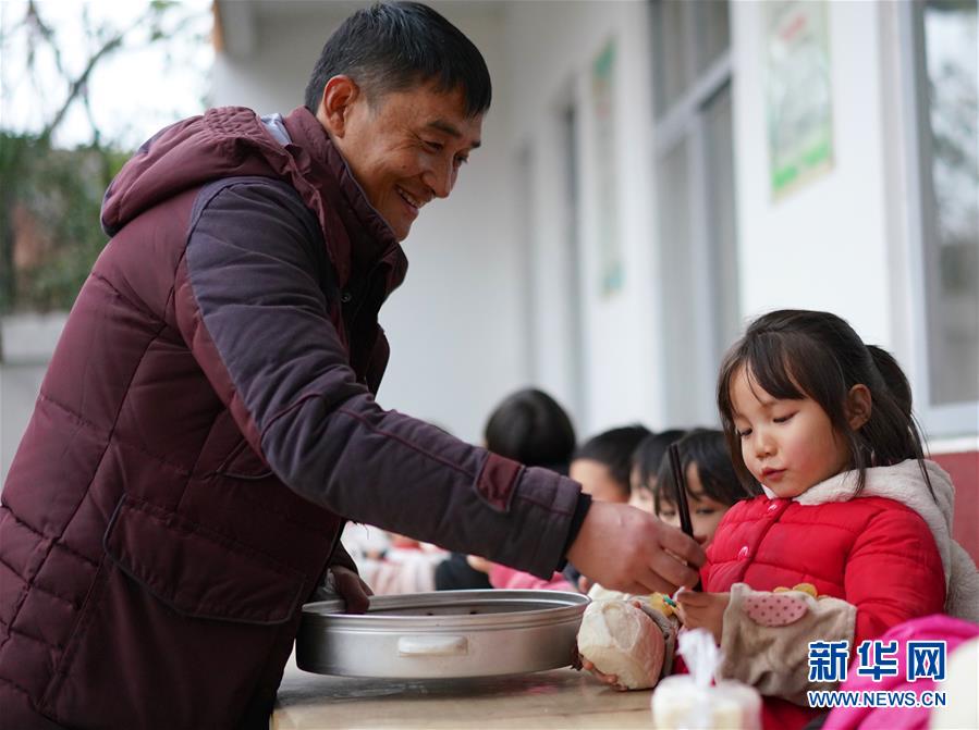 1月3日,燒完飯菜后,章站亮(左)給一位學(xué)生遞送用餐的筷子。 新華社記者 胡晨歡 攝