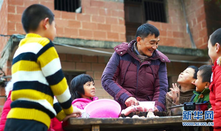 1月3日,章站亮(左三)在學(xué)校的操場(chǎng)上切肉。由于學(xué)校沒(méi)有室內(nèi)的廚房和食堂,章站亮只能在露天的環(huán)境下為學(xué)生們準(zhǔn)備餐點(diǎn)。  新華社記者 胡晨歡 攝