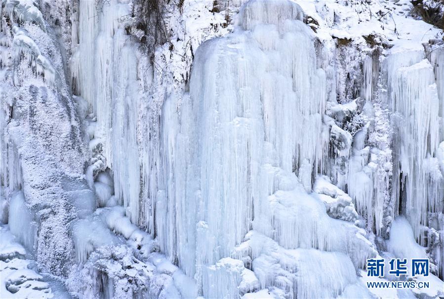 這是在吉林省長白縣十五道溝望天鵝景區(qū)拍攝的冰瀑景觀(1月3日無人機(jī)拍攝)。新華社記者許暢攝