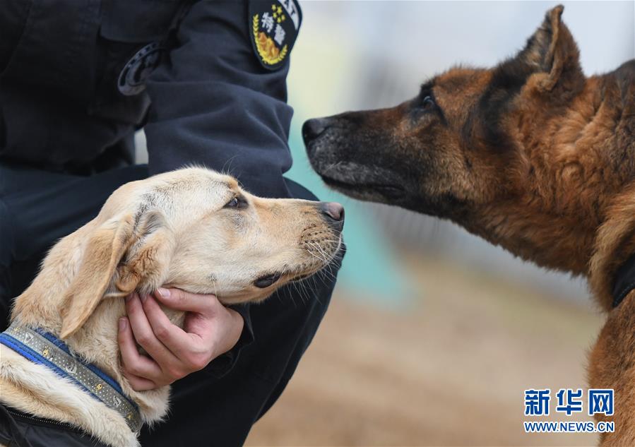 1月15日,即將組成春運搭檔的警犬“皮特”(左)和“哼哼”在進行崗前磨合。 新華社記者 程敏 攝
