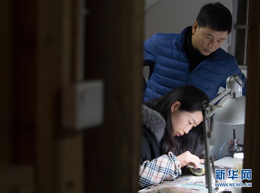 1月15日,吳榮強和妻子李淑敏在龍泉市牛頭嶺村“七分醉”工作室對一件漆繕器皿進行打磨。吳榮強將工作室搬回龍泉后,原本從事設計行業(yè)的妻子也辭職加入工作室的日常工作。 新華社記者翁忻旸攝