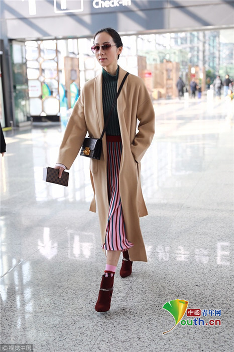 2019年1月17日,上海,韓雪現(xiàn)身機場,穿著條紋紗裙露出小腿,十分抗凍,她搭配經(jīng)典的駝色大衣,氣質(zhì)出眾在機場人群中相當(dāng)搶鏡。