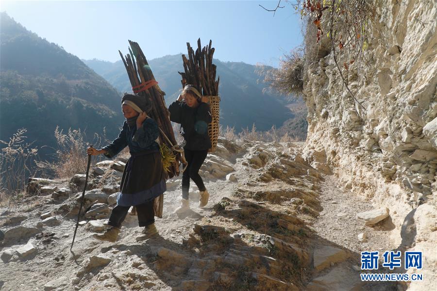 1月25日,在云南省蘭坪縣,余永妹(左)和褚福妹背柴回家。
