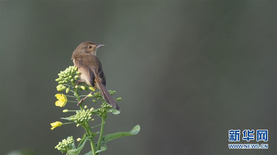 一只小鳥在油菜花枝頭上停歇(2月15日攝)。 新華社記者梅永存攝