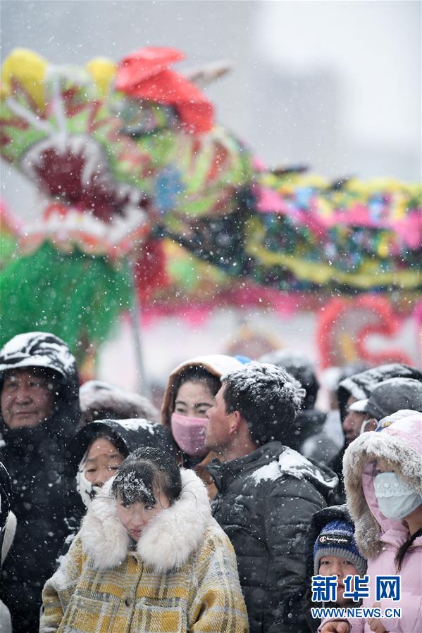 2月16日,群眾在青海省大通回族土族自治縣文化廣場冒雪觀看社火表演。新華社記者吳剛攝