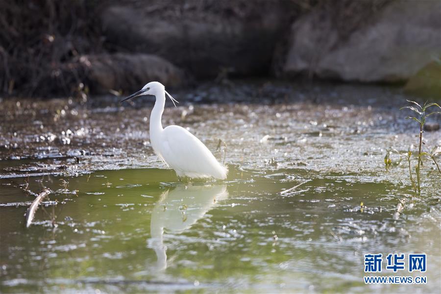 3月7日,在以色列阿格蒙胡拉鳥類和自然公園,一只白鷺在覓食。新華社記者郭昱攝