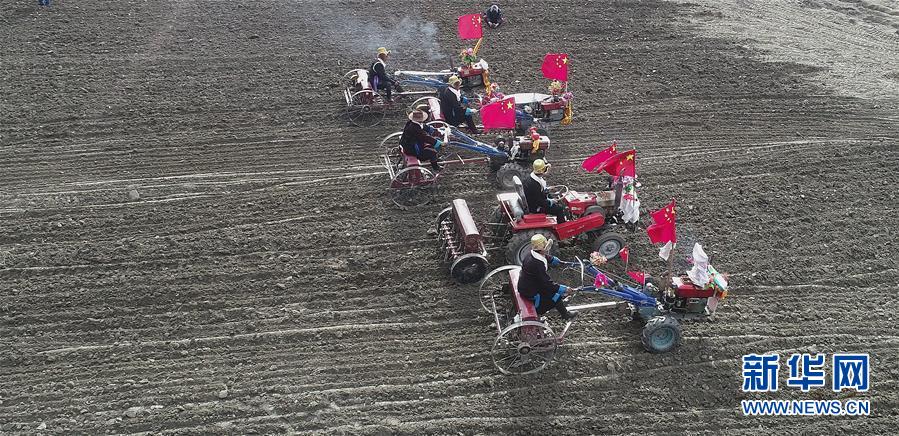 3月16日無人機(jī)拍攝的山南市乃東區(qū)克松社區(qū)開耕儀式現(xiàn)場(chǎng)。當(dāng)日,西藏各地男女老幼身著節(jié)日盛裝,駕著一輛輛由彩旗、花朵裝扮一新的拖拉機(jī),涌向待墾的農(nóng)田,載歌載舞迎來一年一度的開耕儀式。新華社記者 晉美多吉 攝