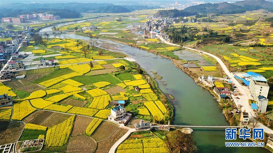 3月20日在貴州錦屏縣敦寨鎮(zhèn)拍攝的春景(無人機拍攝)。春分將至,貴州各地成片的油菜花漸次綻放,如同金色的地毯鋪上云貴高原。 新華社記者 歐東衢 攝