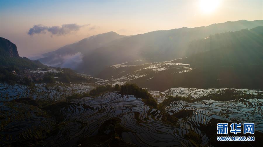 這是在云南省元陽(yáng)縣拍攝的晨曦中的哈尼梯田美景(4月4日無(wú)人機(jī)拍攝)。哈尼梯田位于云南省哀牢山南部,以哈尼族為主的當(dāng)?shù)厝罕娗О倌陙?lái)生生不息在大地上“雕刻”出這一農(nóng)耕文明奇觀。春日里,漫山的水稻梯田與云海、森林、村莊形成一幅美麗的畫(huà)卷,吸引眾多海內(nèi)外游客前來(lái)觀賞。新華社記者 胡超 攝