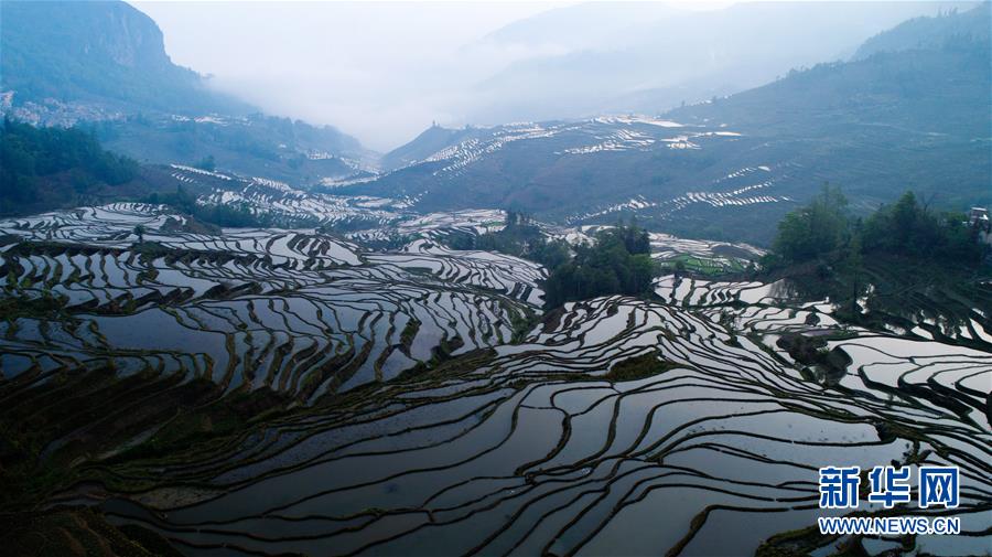 這是在云南省元陽縣拍攝的晨曦中的哈尼梯田美景(4月4日無人機(jī)拍攝)。哈尼梯田位于云南省哀牢山南部,以哈尼族為主的當(dāng)?shù)厝罕娗О倌陙砩幌⒃诖蟮厣稀暗窨獭背鲞@一農(nóng)耕文明奇觀。春日里,漫山的水稻梯田與云海、森林、村莊形成一幅美麗的畫卷,吸引眾多海內(nèi)外游客前來觀賞。新華社記者 胡超 攝